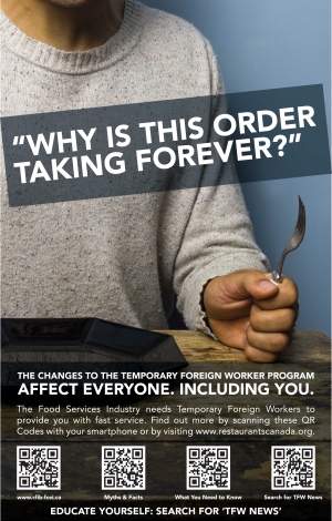 Kenney did not comment on the poster. Instead, he said the use of temporary foreign workers in Alberta restaurants have prevented wages from keeping pace with inflation.
