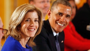 Caroline Kennedy, now U.S. ambassador to Japan, sits next to Barack Obama as they meet with Japan’s Prime Minister Shinzo Abe at the Akasaka Palace in Tokyo in April 2014. (Reuters)