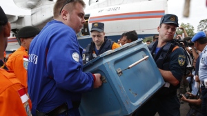 A Russian search and rescue (SAR) team loads their equipment after arriving on a Beriev Be-200 amphibious plane to support the search for Indonesia AirAsia flight QZ8501. (Darren Whiteside/Reuters)