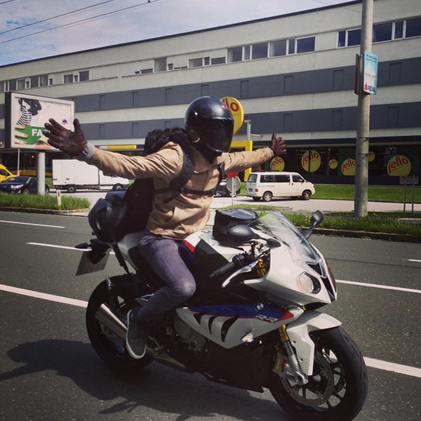 “Don’t try this at home,” he captioned as a man held up his hands in the air while riding a BMW motorcycle down an empty street. “Particularly, in the living room.”