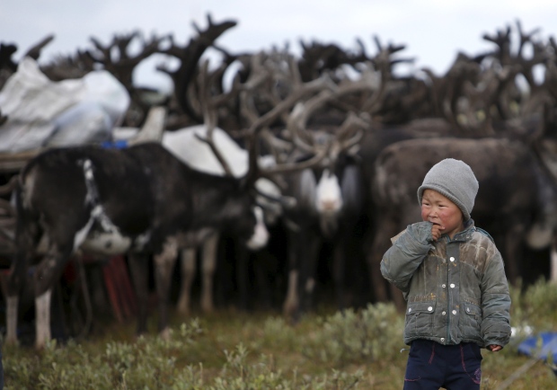 A boy, one of the children of local herders, stands near a herd of reindeer at a camping ground, some 200 km (124 miles) northeast of Naryan-Mar, the administrative centre of Nenets Autonomous Area, far northern Russia, in a 2015 photo. The Russian emergencies ministry said it has evacuated 238 people, including 132 children, from reindeer herders’ camps close to the site of the outbreak. (Sergei Karpukhin/Reuters)