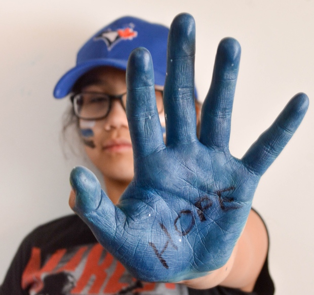 A youth leader attending the Girls at Bat James Bay retreat in the fall of 2016 holds up her hand, painted blue and with the word ‘hope’ written on it. (Jays Care Foundation)