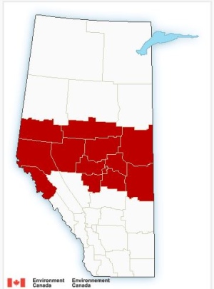 A warning from Environment Canada stretches from Hinton and Grande Prairie in the west, across to the Cold Lake region in the east.