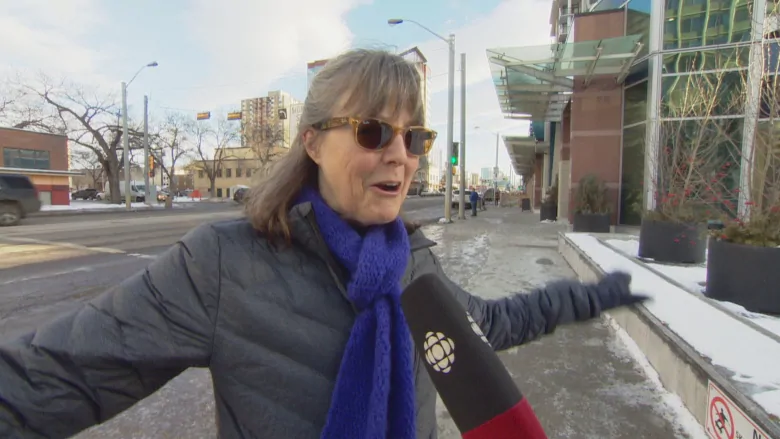 Leslie Watson explains her technique for avoiding a fall on icy sidewalks. (CBC)