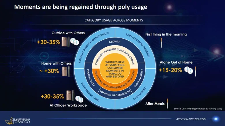 The BAT presentation describes the emergence of “poly-usage” — a cigarette in the morning, a vape at the office during the day — and, after dinner, perhaps another one of the new “potentially reduced risk products” (PRRPs), which include vapour devices, heated tobacco devices that use tobacco to generate a nicotine-containing aerosol, and new forms of nicotine pouches for the mouth.