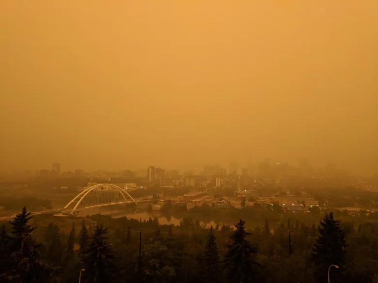 Views of Edmonton’s river valley were dystopian as wildfire smoke cloaked the city in the summer of 2018. (@Raptor_Chick/Twitter)