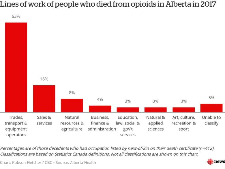 According to a review by Alberta Health, the most common line of work, by far, for people who died from opioids in 2017 was “trades, transport and equipment operators.”