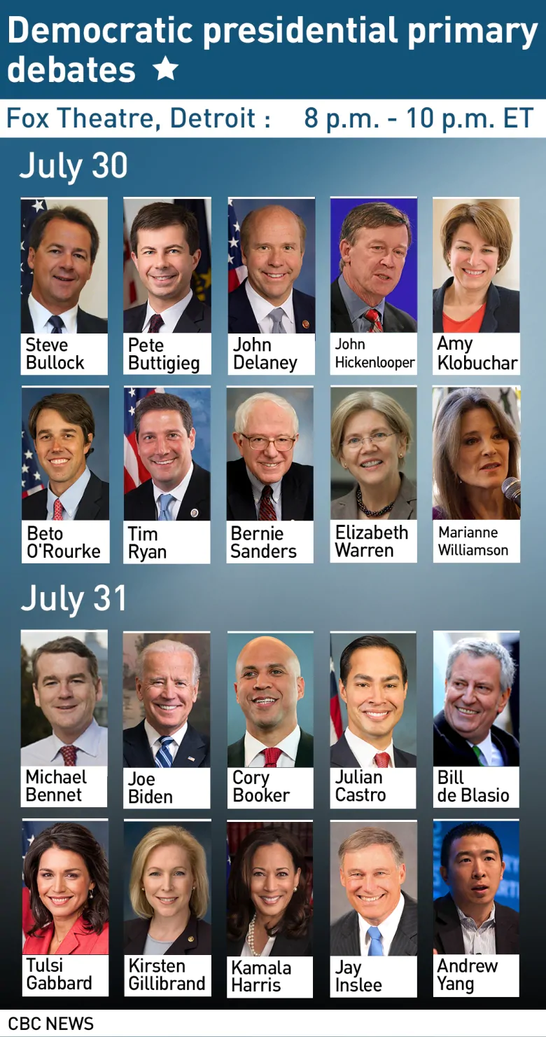 Twenty candidates are spread evenly over two nights Tuesday and Wednesday. The second night of debates will feature early front-runner and former vice-president Joe Biden and California Sen. Kamala Harris. CNN, which is hosting the debates, chose the groupings at random.
